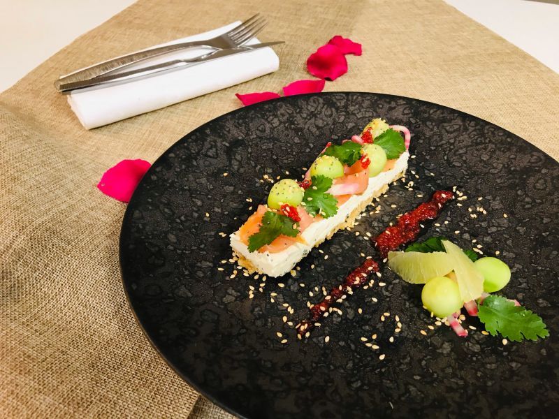 L’Entrée « Cheesecake saumon concombre, œufs de lompes »
