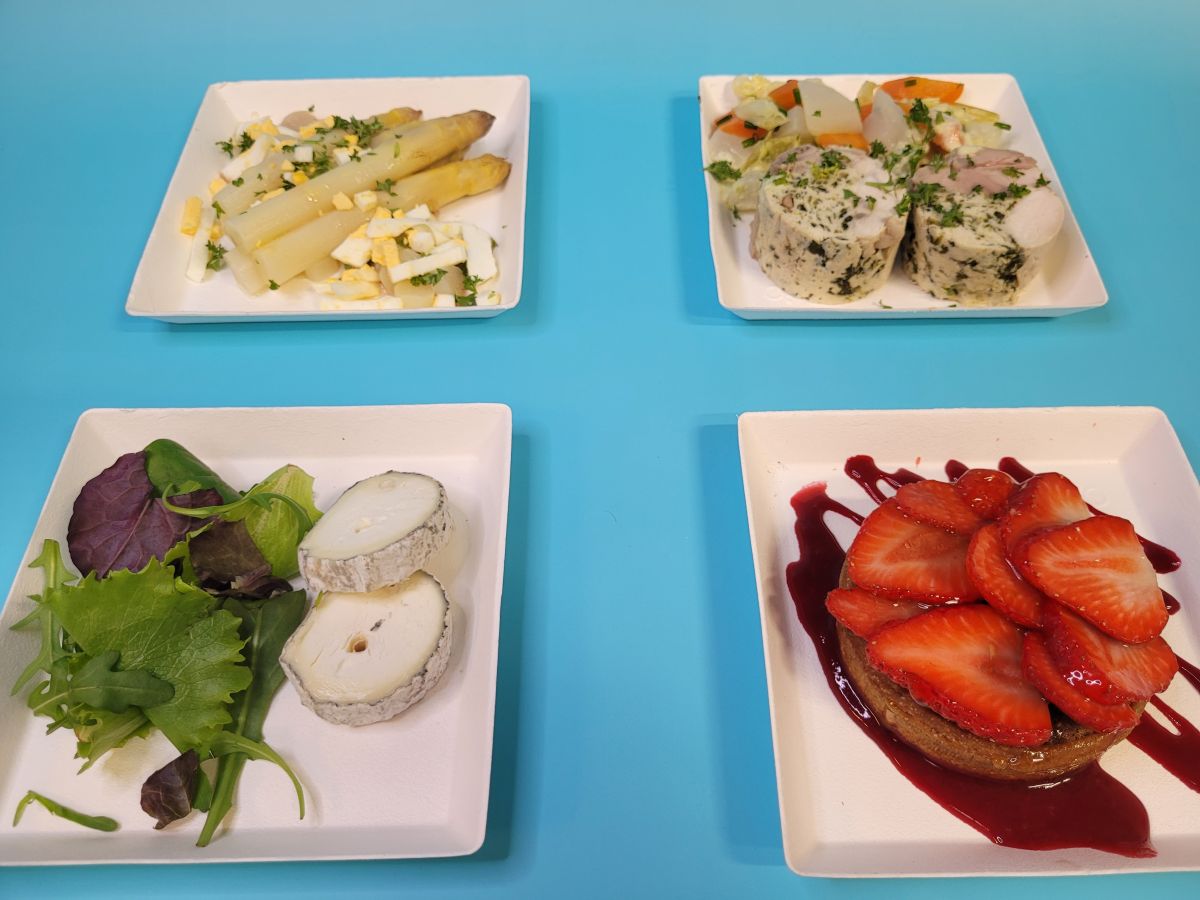 Bottelée d'Asperges (vertes ou blanches) en mimosa, Crème de cives / Poulette de Racan en Verdurette (chou vert, carotte, navet, céleri branche) / Sainte Maure de Touraine, salades / Tartelette aux fraises / Pain